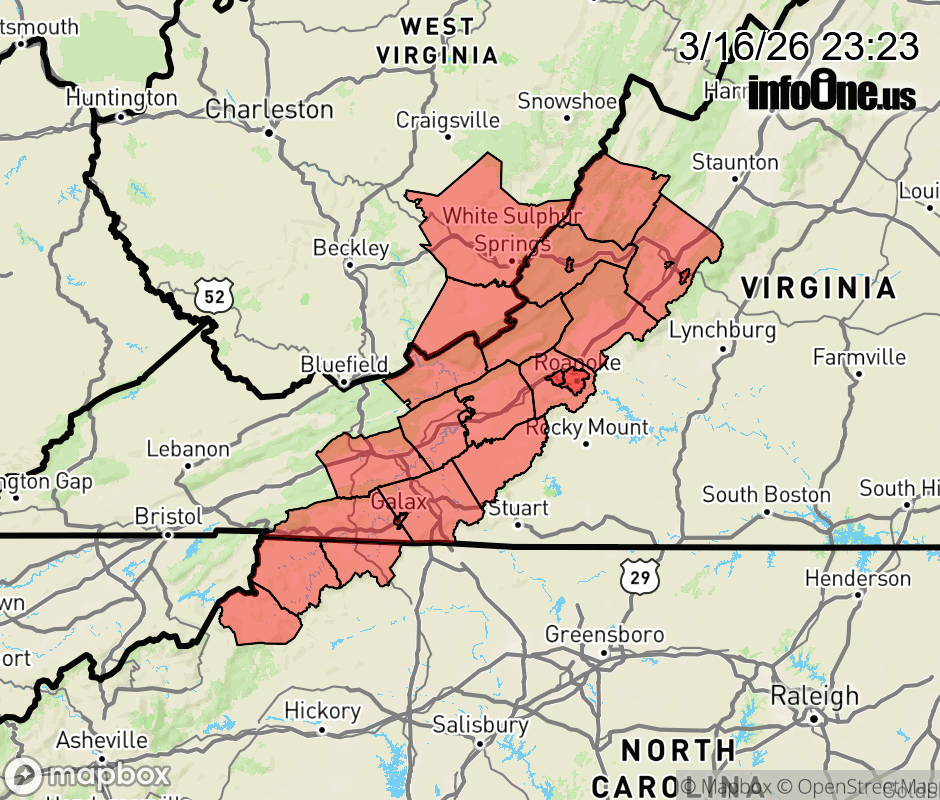 Canceled 3/17/26 7:45 AM Special Weather Statement issued March 16 at 11:22PM EDT by NWS Blacksburg VA Snow showers may lead to additional accumulations, mainly for the western mountains tonight, tapering off to flurries tomorrow. Other locations will see snow ending tonight. Wet or snowy roads may remain slick as temperatures fall below freezing everywhere. Temperatures tomorrow will be slow to rise, and areas along and west of the Blue Ridge will not rise above freezing, keeping some roads slippery. Please use caution if driving. Slow down and allow extra time to reach your destination. ![]() |