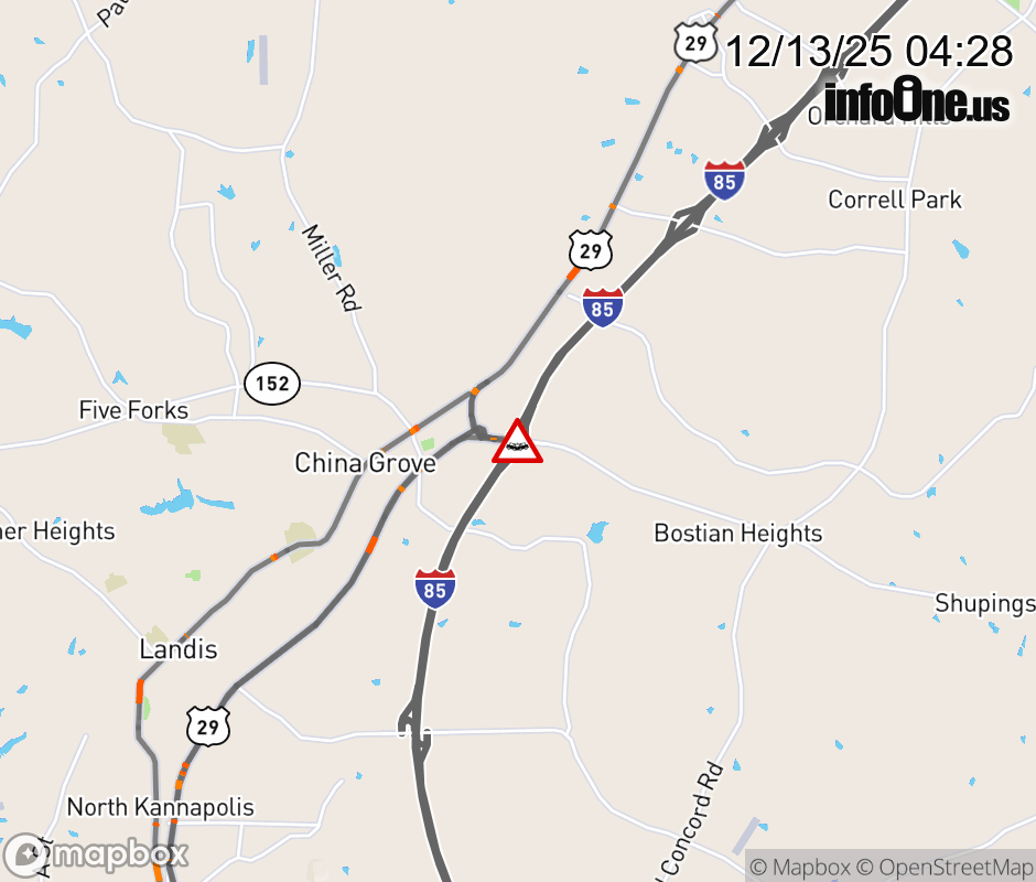The right shoulder is closed at Exit 68 (NC 152). Updated: Sat 12/13/25 4:28 AM EST ![]() Updated: Sat 12/13/25 4:28 AM EST |