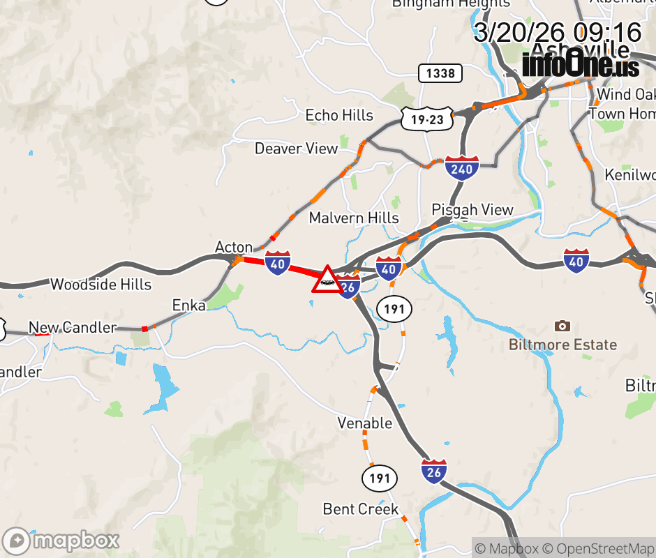 The left shoulder is closed near Exit 46A, I-26 East. Updated: Fri 3/20/26 9:16 AM EDT ![]() Updated: Fri 3/20/26 9:16 AM EDT |