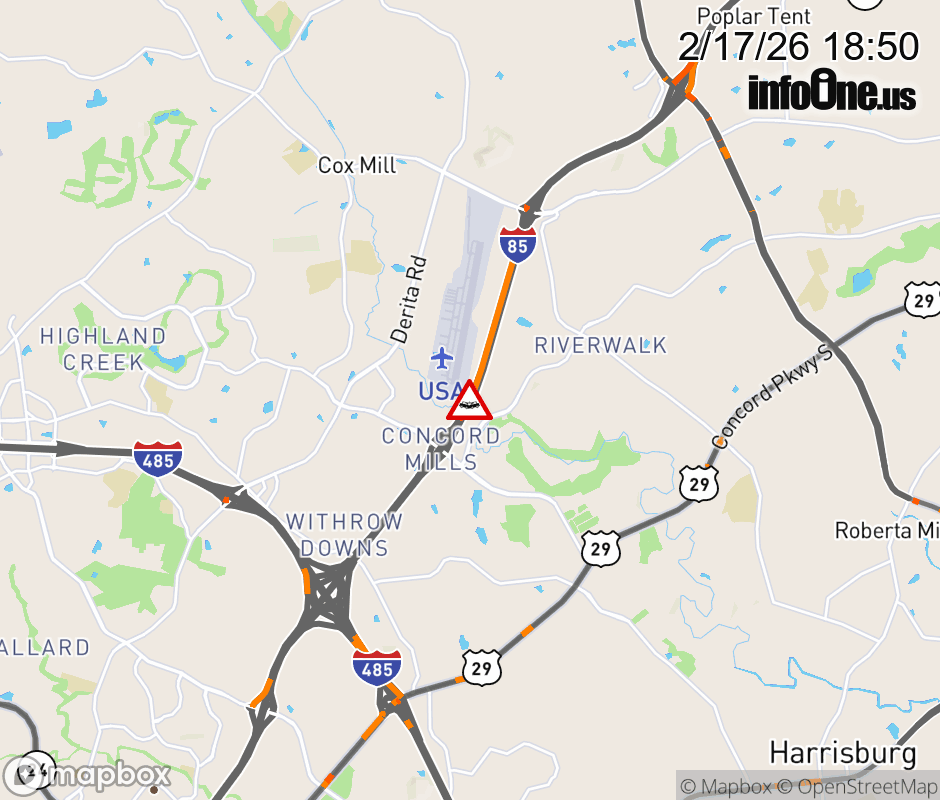 The two right lanes are closed prior to Exit 49 (Bruton Smith Blvd). Updated: Tue 2/17/26 6:50 PM EST ![]() Updated: Tue 2/17/26 6:50 PM EST |