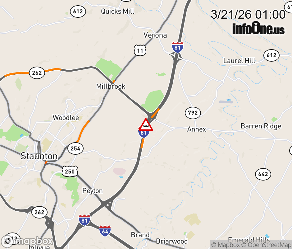 On I-81 South at mile marker 225.3 in the County of Augusta, motorists can expect delays due to a vehicle crash. Updated: Sat 3/21/26 1:00 AM EDT ![]() Updated: Sat 3/21/26 1:00 AM EDT |