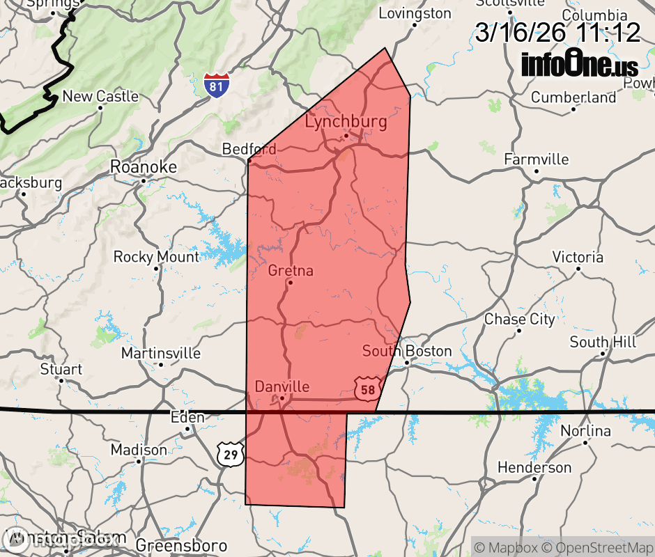 Canceled 3/16/26 11:38 AM Severe Thunderstorm Warning issued March 16 at 11:11AM EDT until March 16 at 12:15PM EDT by NWS Blacksburg VA SVRRNK The National Weather Service in BLACKSBURG has issued a * Severe Thunderstorm Warning for... Eastern Rockingham County in north central North Carolina... Caswell County in north central North Carolina... Western Appomattox County in central Virginia... The City of Danville in south central Virginia... Campbell County in central Virginia... Pittsylvania County in south central Virginia... Western Halifax County in south central Virginia... Southeastern Bedford County in south central Virginia... Southeastern Amherst County in central Virginia... The City of Lynchburg in central Virginia... * Until 1215 PM EDT. * At 1110 AM EDT, severe thunderstorms were located along a line extending from Forest to near Sandy River to near Quick, moving northeast at 40 mph. HAZARD...60 mph wind gusts. SOURCE...Radar indicated. IMPACT...Expect damage to roofs, siding, and trees. * Locations impacted include... Lynchburg... Danville... Bedford... Altavista... Amherst... Yanceyville... and Bethel. ![]() |