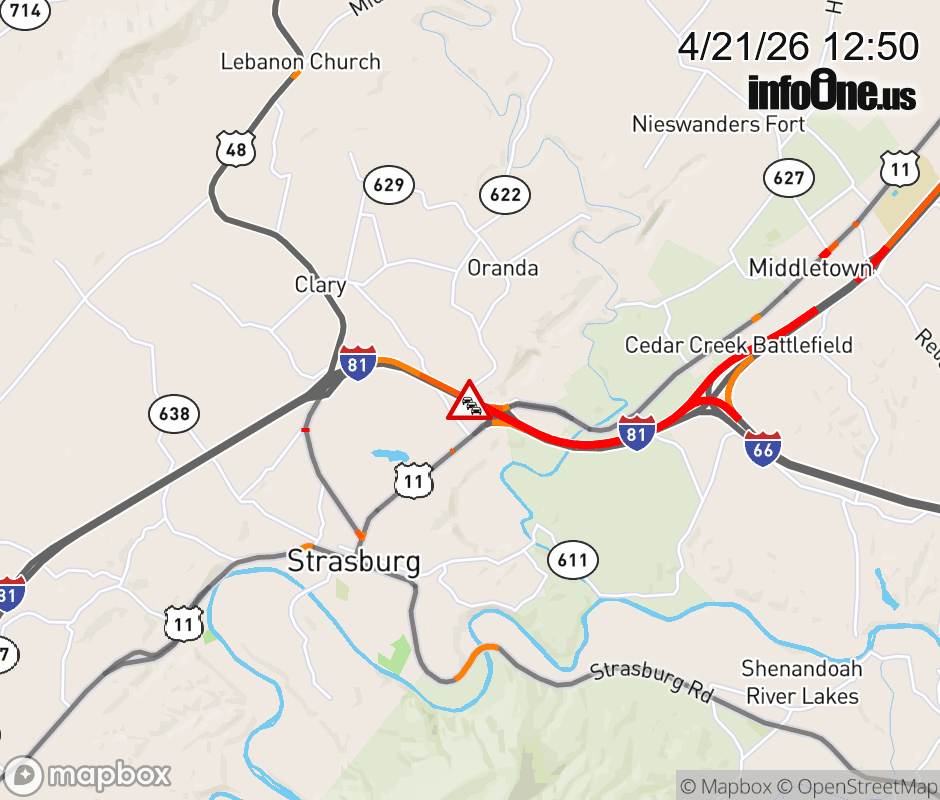 On I-81 South at mile marker 298 in the County of Shenandoah, motorists can expect delays due to congestion. Traffic backups are approximately 9.0 miles. Updated: Tue 4/21/26 12:50 PM EDT ![]() Updated: Tue 4/21/26 12:50 PM EDT |