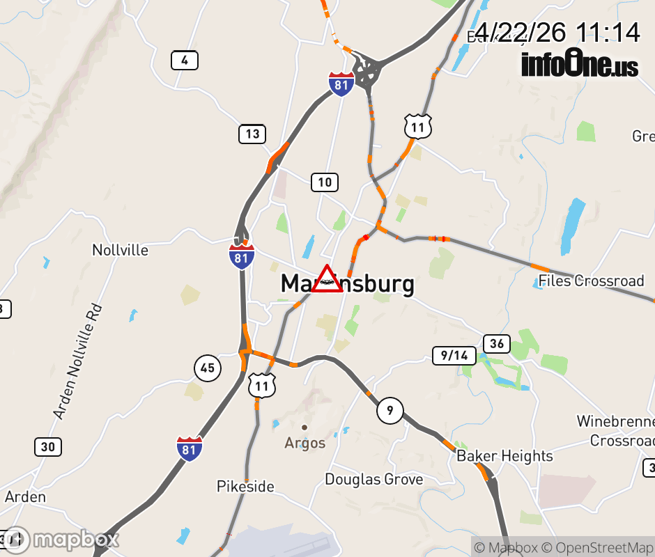 Vehicle Crash on US-11 (W King Street) & CR-9/56 (S Raleigh St) in Martinsburg. The northbound road is closed. The southbound road is closed. Updated: Wed 4/22/26 11:14 AM EDT ![]() Updated: Wed 4/22/26 11:14 AM EDT |
