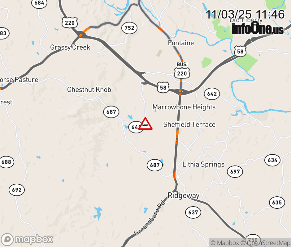 On Rt. 641 North in the County of Henry, in the vicinity of Memory Ln; Soapstone Rd; Rt. 896N/S (Henry County), motorists can expect delays due to a vehicle crash. Lane closures exist. ![]() |