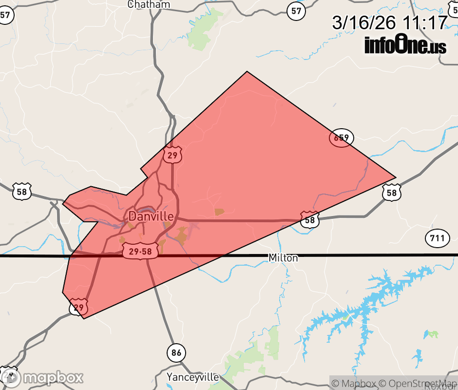 Canceled 3/16/26 11:34 AM Tornado Warning issued March 16 at 11:15AM EDT until March 16 at 11:45AM EDT by NWS Blacksburg VA TORRNK The National Weather Service in BLACKSBURG has issued a * Tornado Warning for... Northwestern Caswell County in north central North Carolina... The City of Danville in south central Virginia... Southeastern Pittsylvania County in south central Virginia... Southwestern Halifax County in south central Virginia... * Until 1145 AM EDT. * At 1115 AM EDT, a severe thunderstorm capable of producing a tornado was located over Pelham, or near Bethel, moving northeast at 45 mph. HAZARD...Tornado. SOURCE...Radar indicated rotation. IMPACT...Flying debris will be dangerous to those caught without shelter. Mobile homes will be damaged or destroyed. Damage to roofs, windows, and vehicles will occur. Tree damage is likely. * Locations impacted include... Danville... Gatewood... Westover Hills... Pelham... Elmo... Ringgold... and Keeling. ![]() |