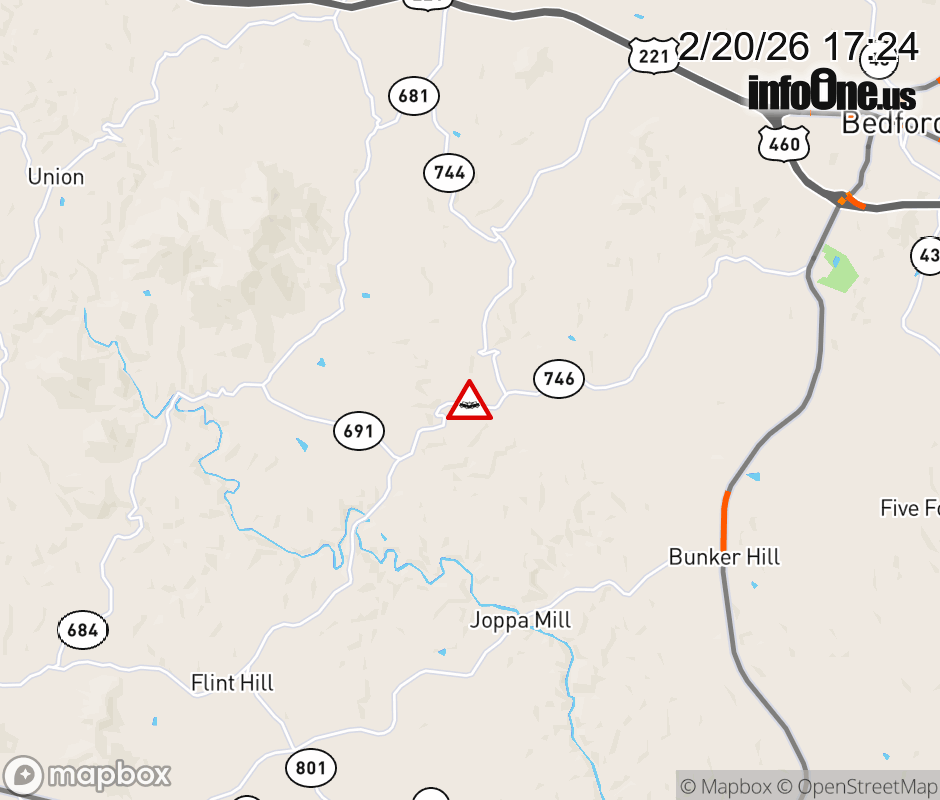 On Rt. 746 East in the County of Bedford, in the vicinity of Wheatland Rd; Rt. 680N/S (Bedford County), motorists can expect delays due to a vehicle crash. Lane closures exist. Updated: Fri 2/20/26 5:24 PM EST ![]() Updated: Fri 2/20/26 5:24 PM EST |