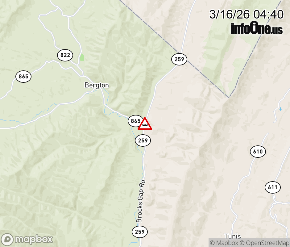 On VA-259 in the County of Rockingham, in the vicinity of Bergton Rd; Rt. 820N/S (Rockingham County), motorists can expect delays due to a tractor trailer crash. All south lanes are closed. ![]() |