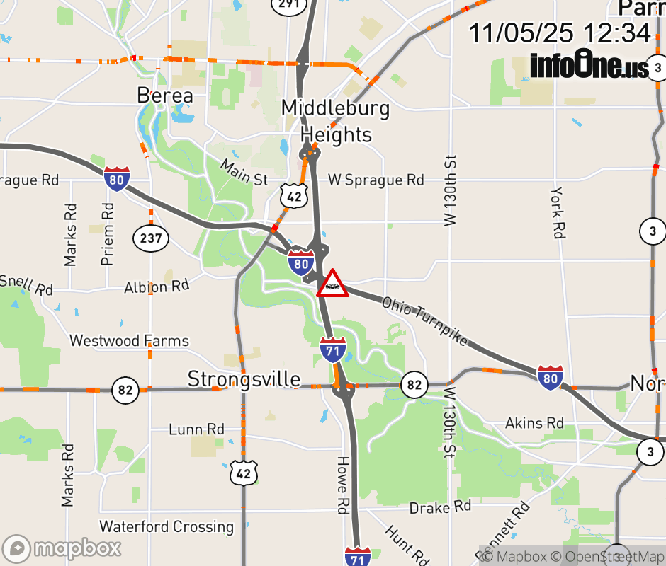 The left lane is blocked on I-80 West (Ohio Turnpike) at I-71, due to a crash. Updated: Wed 11/5/25 12:34 PM EST ![]() Updated: Wed 11/5/25 12:34 PM EST |