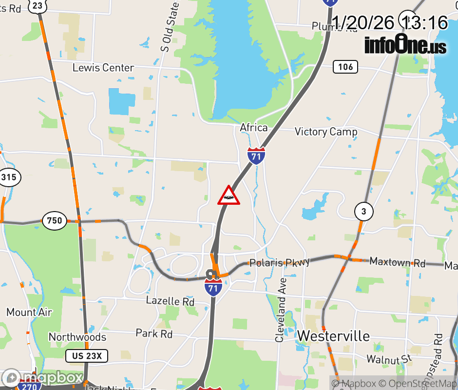 The left shoulder is blocked on I-71 South beyond Delaware County Rest Area 6-26, due to a crash. ![]() |