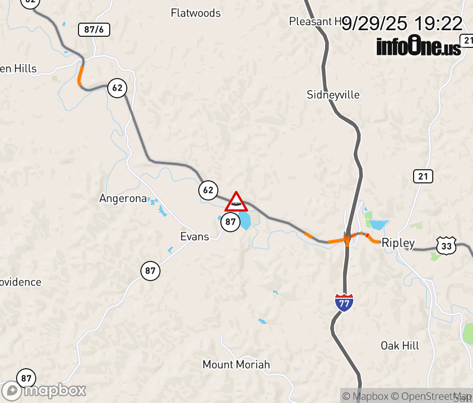 In Jackson County there is a Vehicle Crash on WV-62 at Mile Marker 10.73. Ripley Rd @ Evansview Rd. ![]() |