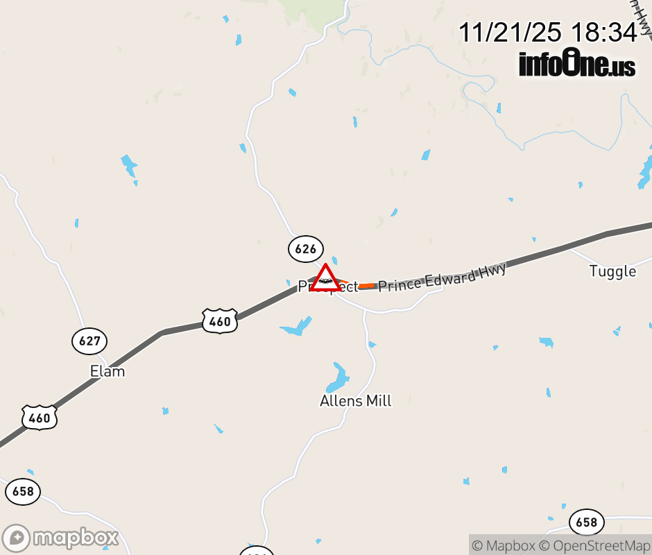 On US-460 in the County of Prince Edward, in the vicinity of Peaks Rd; Rt. 626N/S (Prince Edward County), motorists can expect delays due to a vehicle crash. All west lanes are closed. ![]() |