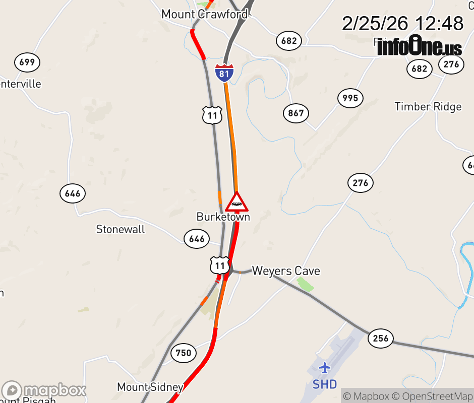 On I-81 North at mile marker 236.5 in the County of Augusta, motorists can expect delays due to a tractor trailer crash. Traffic backups are approximately 5.0 miles. Updated: Wed 2/25/26 12:48 PM EST ![]() Updated: Wed 2/25/26 12:48 PM EST |