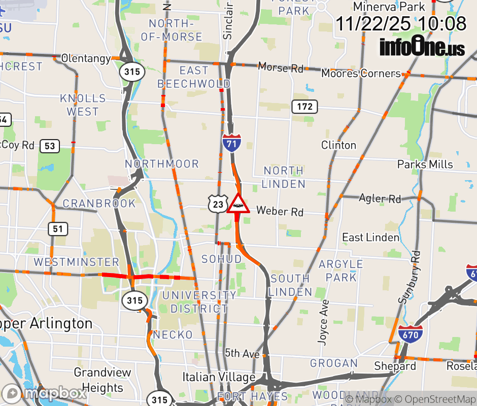 The 2 left lanes are blocked on I-71 South at Weber Rd, due to a crash. Updated: Sat 11/22/25 10:08 AM EST ![]() Updated: Sat 11/22/25 10:08 AM EST |