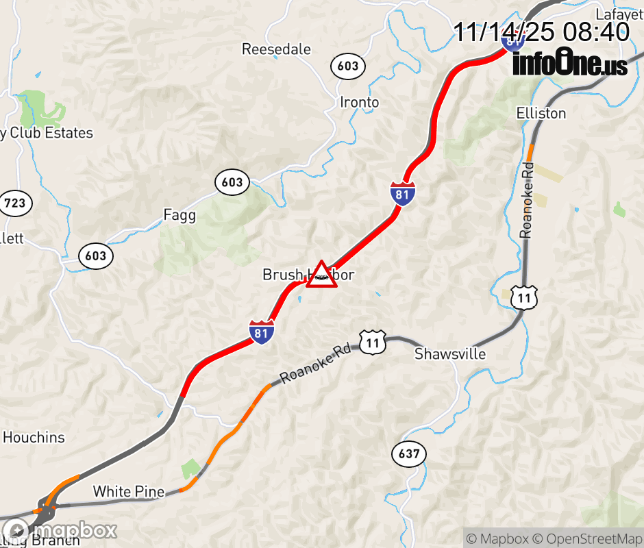 On I-81 at mile marker 123.7 in the County of Montgomery, motorists can expect delays due to a vehicle crash. The north left shoulder and left lane are closed. Traffic backups are approximately 2.5 miles. Updated: Fri 11/14/25 8:40 AM EST ![]() Updated: Fri 11/14/25 8:40 AM EST |