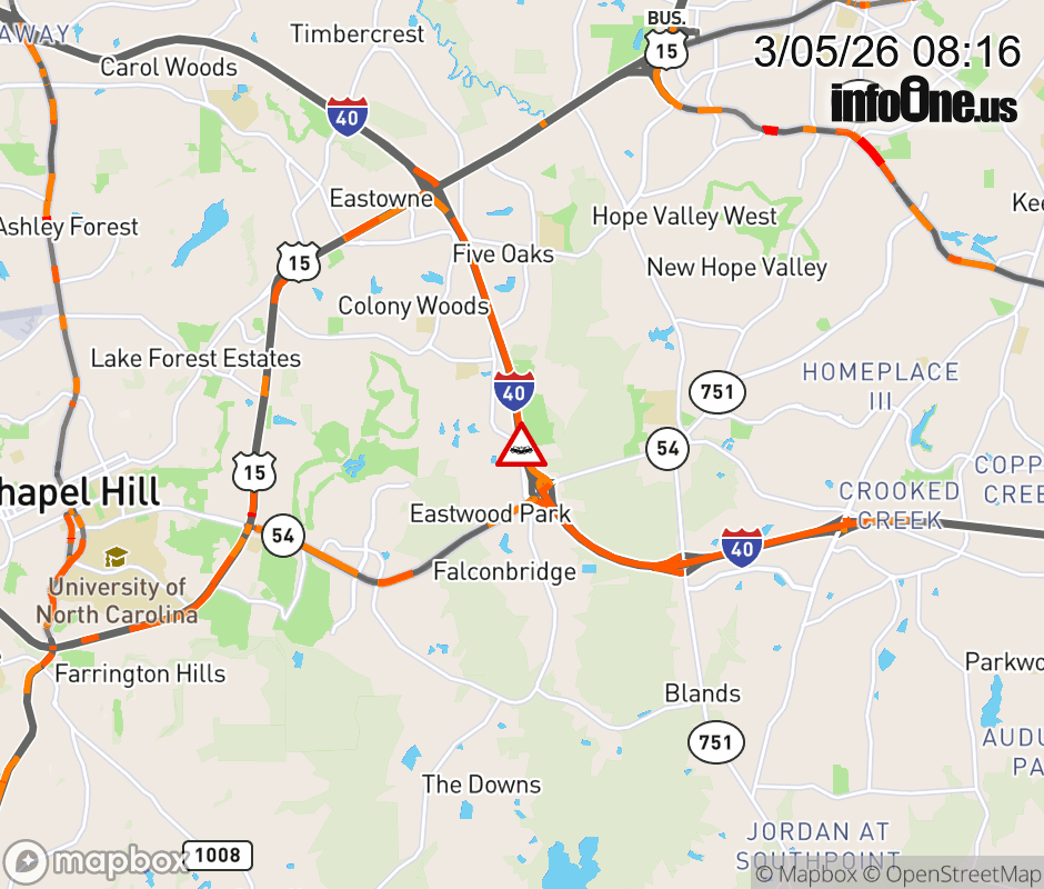 The right shoulder is closed at Exit 273 (NC-54). Updated: Thu 3/5/26 8:16 AM EST ![]() Updated: Thu 3/5/26 8:16 AM EST |