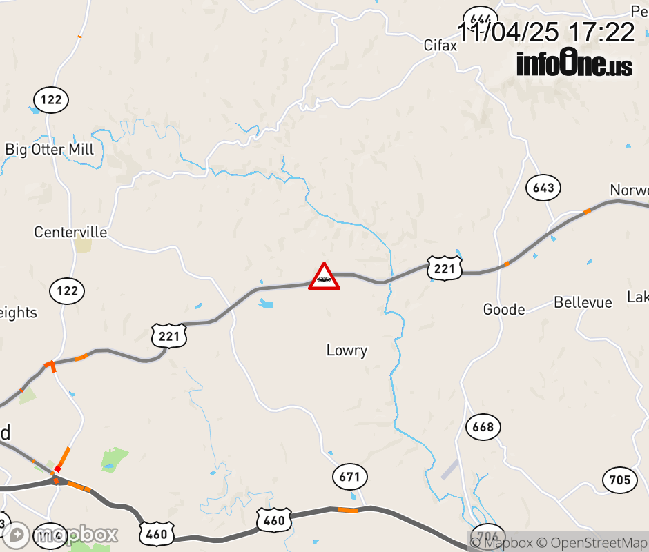 On US-221 in the County of Bedford, in the vicinity of Otter River Dr; Rt. 9752N/S (Bedford County), motorists can expect delays due to a vehicle crash. All north lanes are closed. All south lanes are closed. Updated: Tue 11/4/25 5:22 PM EST ![]() Updated: Tue 11/4/25 5:22 PM EST |
