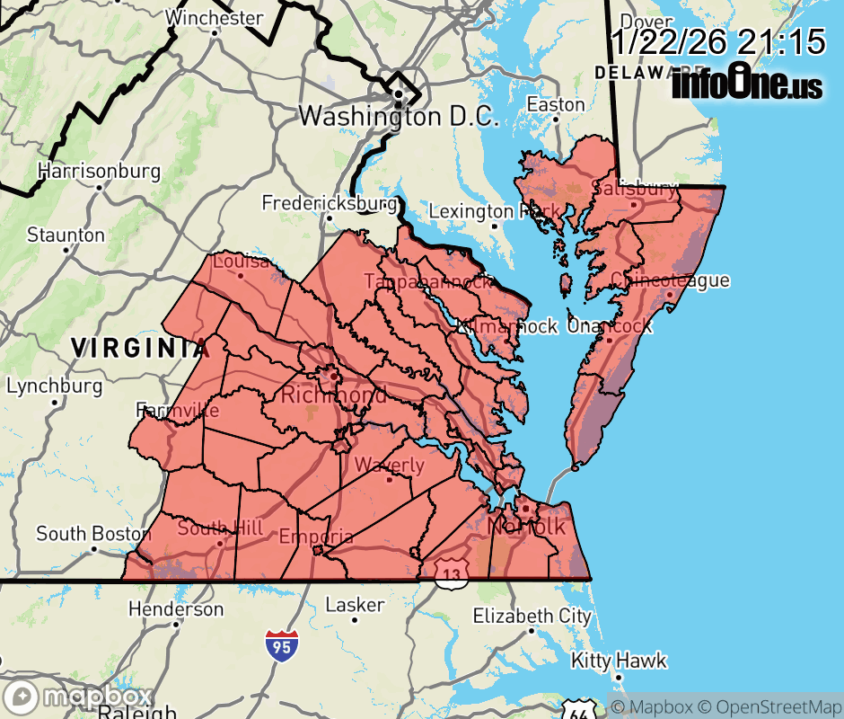 Cold Weather Advisory issued January 22 at 9:13PM EST until January 24 at 10:00AM EST by NWS Wakefield VA * WHAT... Very cold wind chills between 5 below to 5 above is expected. * WHERE... Portions of southeast Maryland and central, east central, eastern, north central, south central, and southeast Virginia. * WHEN... From 8 PM Friday to 10 AM EST Saturday. * IMPACTS... The cold wind chills as low as 5 above could result in hypothermia if precautions are not taken. ![]() |