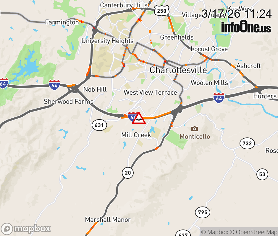 On I-64 East at mile marker 120.6 in the County of Albemarle, motorists can expect delays due to a vehicle crash. Updated: Tue 3/17/26 11:24 AM EDT ![]() Updated: Tue 3/17/26 11:24 AM EDT |