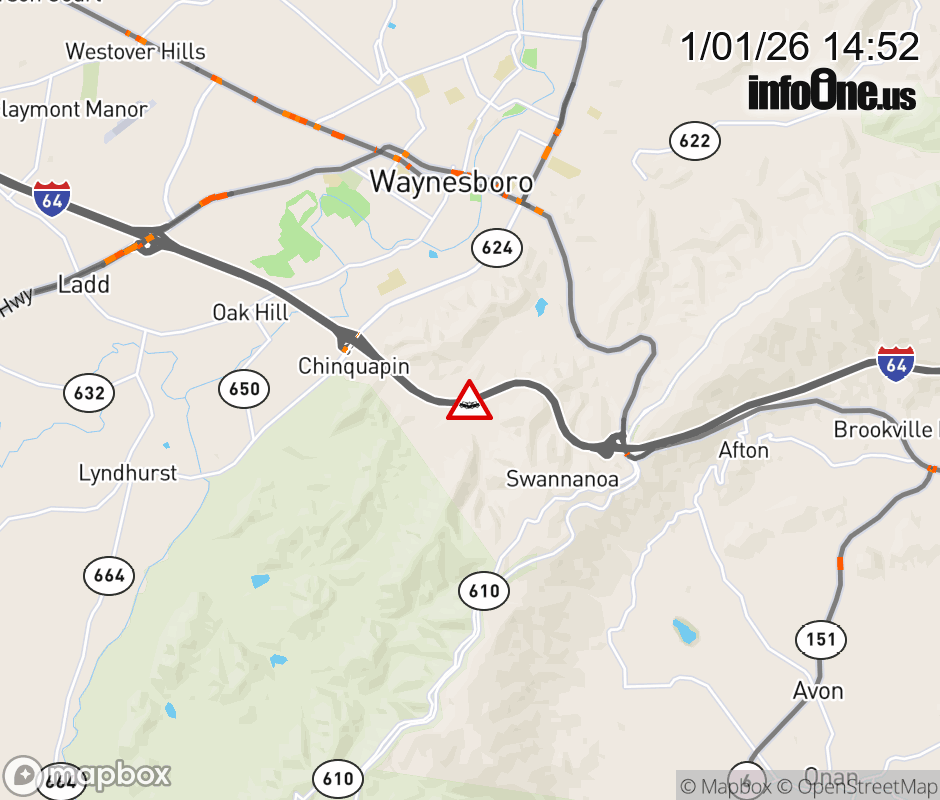 On I-64 at mile marker 98 in the County of Augusta, motorists can expect delays due to a vehicle crash. The west right shoulder is closed. Updated: Thu 1/1/26 2:52 PM EST ![]() Updated: Thu 1/1/26 2:52 PM EST |