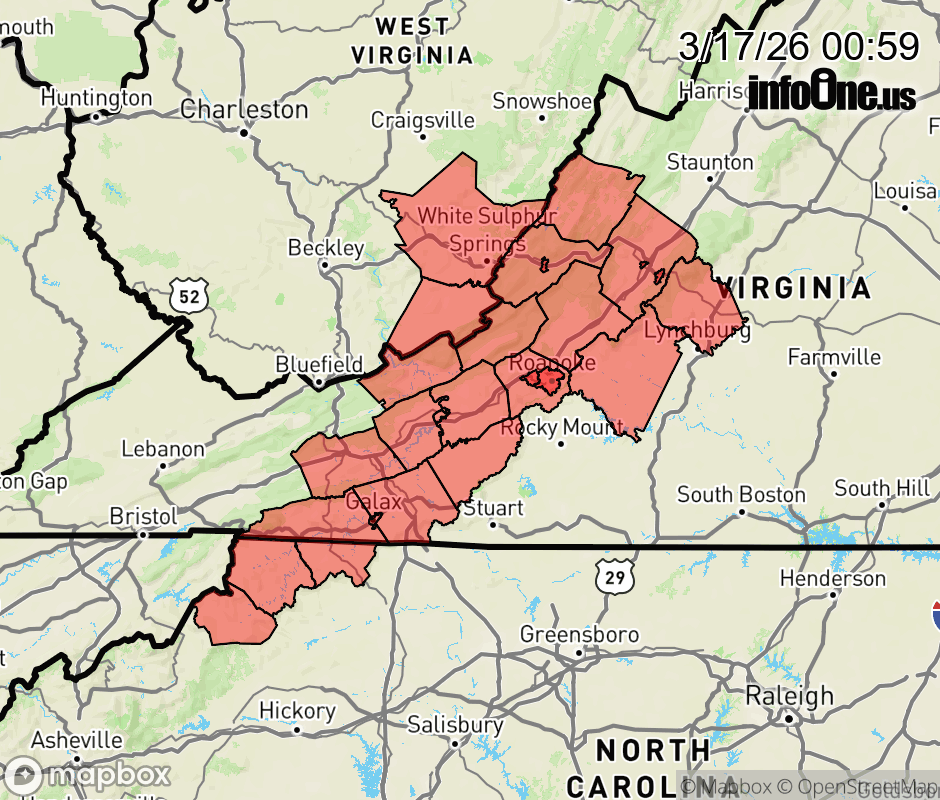 Canceled 3/17/26 5:00 AM Wind Advisory issued March 17 at 12:58AM EDT until March 17 at 5:00AM EDT by NWS Blacksburg VA * WHAT... West winds 15 to 25 mph with gusts up to 50 mph, especially at the higher elevations. * WHERE... Portions of northwest North Carolina, southwest Virginia, and southeast West Virginia. * WHEN... Until 5 AM EDT early this morning. * IMPACTS... Gusty winds will blow around unsecured objects. Tree limbs could be blown down and a few power outages may result. ![]() |