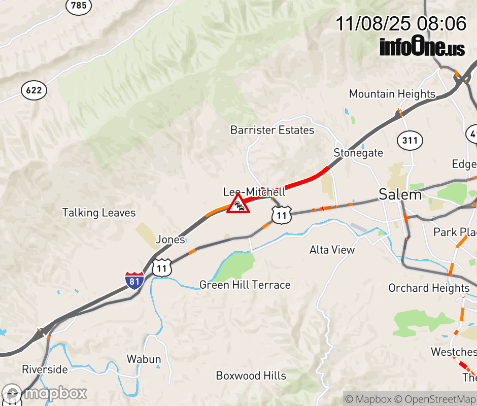 On I-81 South at mile marker 136.6 in the County of Roanoke, motorists can expect delays due to a vehicle fire. Traffic backups are approximately 1.0 mile. Updated: Sat 11/8/25 8:06 AM EST ![]() Updated: Sat 11/8/25 8:06 AM EST |