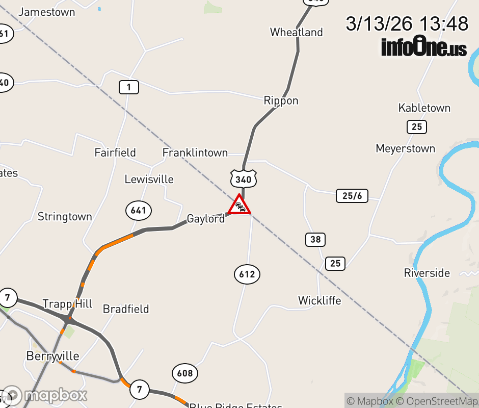 On US-340 in the County of Clarke, in the vicinity of WEST VIRGINIA STATE LINE, motorists can expect delays due to an incident. All north lanes are closed. Updated: Fri 3/13/26 1:48 PM EDT ![]() Updated: Fri 3/13/26 1:48 PM EDT |