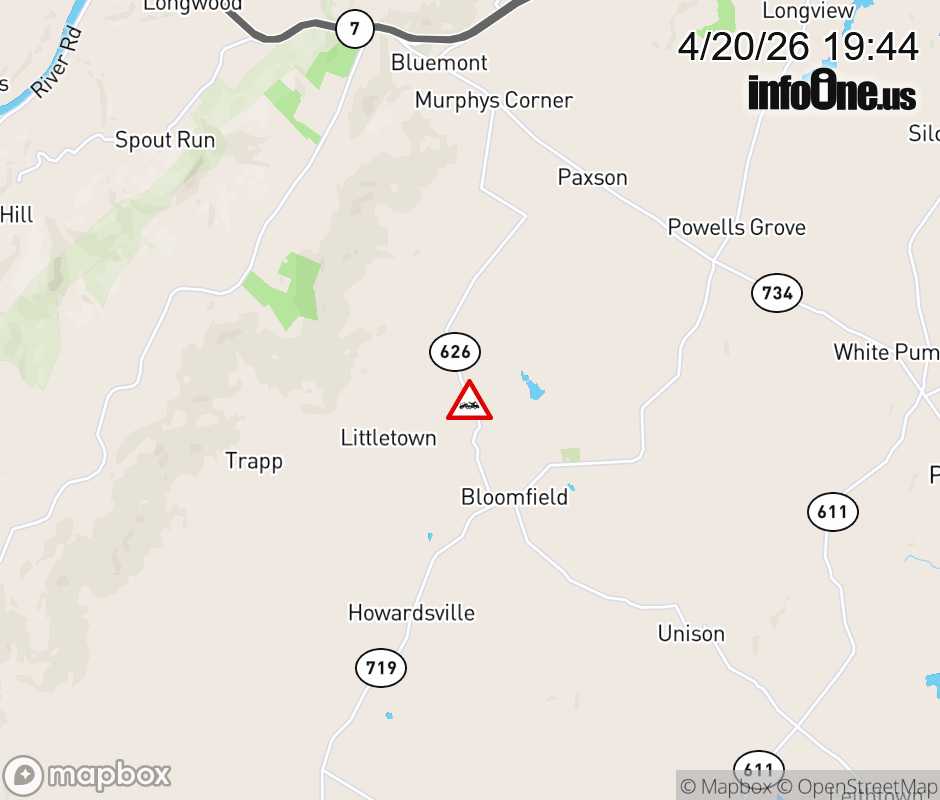 On Rt. 626 in the County of Loudoun, in the vicinity of Austin Grove Rd; Rt. 739E/W (Loudoun County), motorists can expect delays due to a disabled vehicle. All north lanes are closed. All south lanes are closed. Updated: Mon 4/20/26 7:44 PM EDT ![]() Updated: Mon 4/20/26 7:44 PM EDT |