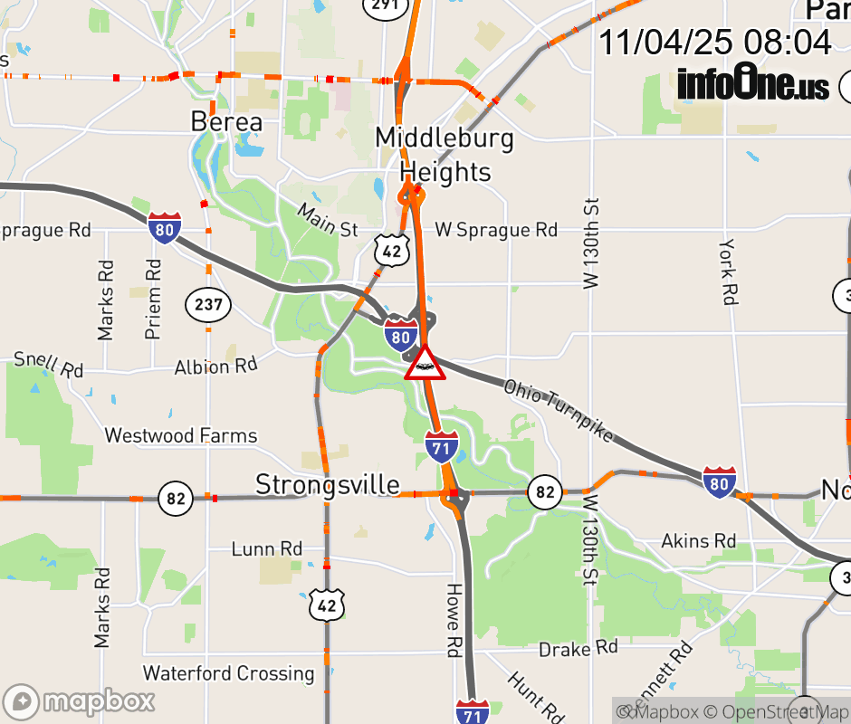 The left shoulder is blocked on I-71 North beyond SR-82/Royalton Rd, due to a crash. Updated: Tue 11/4/25 8:04 AM EST ![]() Updated: Tue 11/4/25 8:04 AM EST |