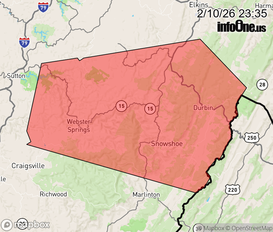 Canceled 2/11/26 12:00 AM Special Weather Statement issued February 10 at 11:34PM EST by NWS Charleston WV At 1133 PM EST, Doppler radar was tracking a strong thunderstorm near Webster Springs, moving east at 85 mph. HAZARD...Wind gusts up to 40 mph and half inch hail. SOURCE...Radar indicated. IMPACT...Gusty winds could knock down tree limbs and blow around unsecured objects. Minor hail damage to vegetation is possible. Locations impacted include... Cass Scenic Railroad, Greenbank, Webster Springs, Addison (Webster Springs), Mill Creek, Snowshoe, Holly River State Park, Mingo, Cowen, Durbin, Huttonsville, Arbovale, Cheat Bridge, Eden, Upper Glade, Helvetia, Pickens, Cleveland, Waneta, and Boyer. ![]() |