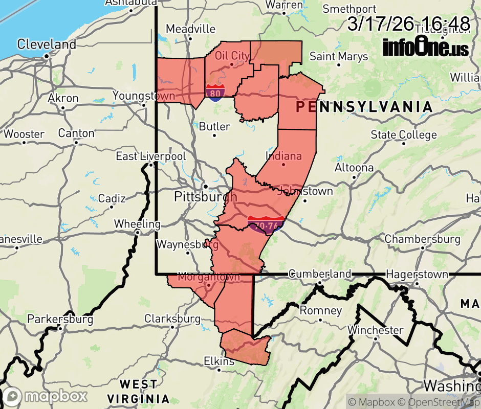 Canceled 3/17/26 11:00 PM Special Weather Statement issued March 17 at 4:47PM EDT by NWS Pittsburgh PA Scattered snow showers and localized heavier bands of snow will continue through the evening rush hour. Visibility could briefly be reduced to a quarter of a mile or less in the heaviest snow showers. Road temperatures remain warm, but will cool with sunset, and heavy rates could produce a quick coating and slick conditions, especially on bridges and overpasses. Use caution if you encounter a heavy snow shower while traveling. ![]() |