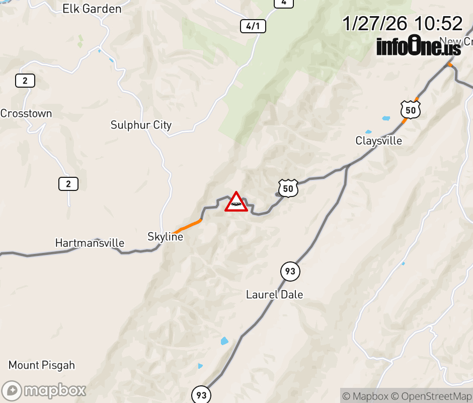Vehicle Crash on US-50 between WV-93 and WV-42. Updated: Tue 1/27/26 10:52 AM EST ![]() Updated: Tue 1/27/26 10:52 AM EST |