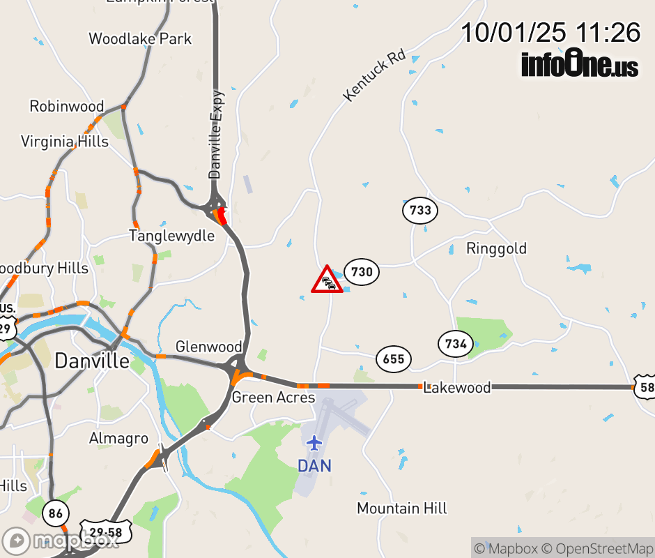 On Rt. 729 in the County of Pittsylvania, in the vicinity of Eagle Springs Rd; Wilkerson Rd; Rt. 730E/W (Pittsylvania County), motorists can expect delays due to an incident. All north lanes are closed. All south lanes are closed. ![]() |