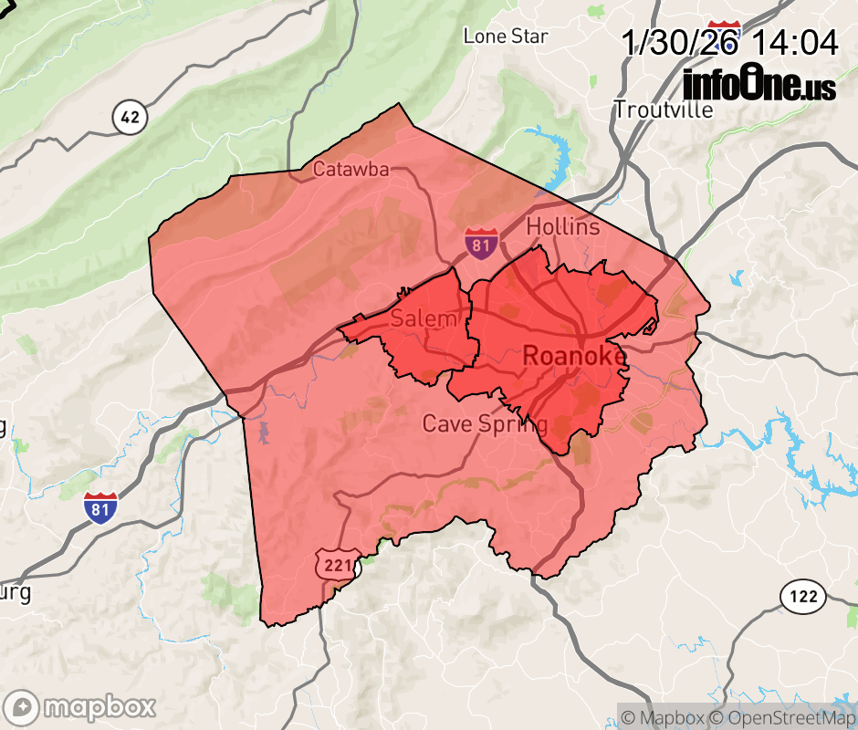 Canceled 1/30/26 8:24 PM Winter Weather Advisory issued January 30 at 2:02PM EST until February 1 at 7:00AM EST by NWS Blacksburg VA * WHAT... Snow. Snow accumulations between 1 and 3 inches. Winds gusting as high as 55 mph. * WHERE... Roanoke County. * WHEN... Until 7 AM EST Sunday. * IMPACTS... Plan on slippery road conditions. The hazardous conditions could impact the Friday evening commute. Strong winds could cause tree damage. ![]() |