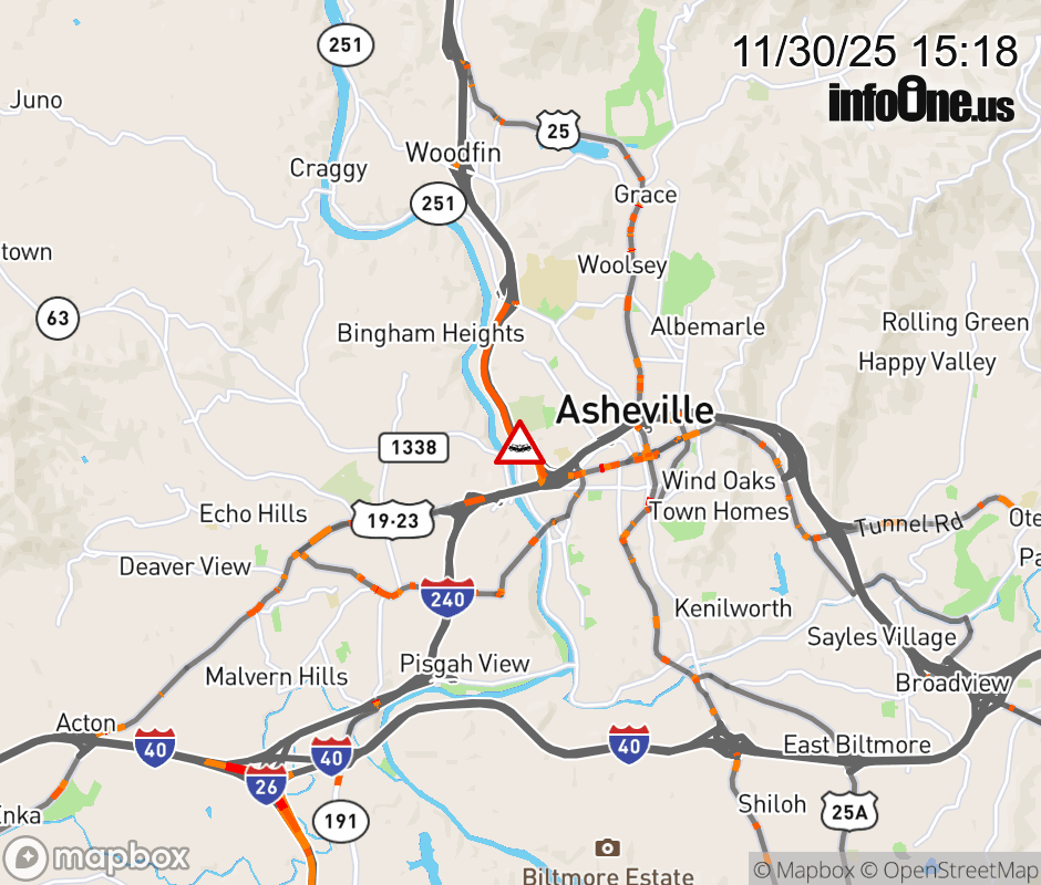 The right shoulder is closed after Exit 25, NC 251 (Riverside Drive) due to a crash. Updated: Sun 11/30/25 3:18 PM EST ![]() Updated: Sun 11/30/25 3:18 PM EST |