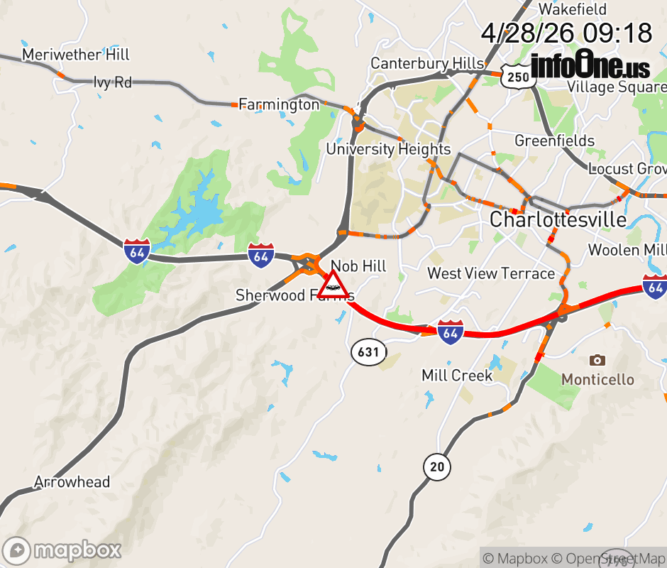 On I-64 West at mile marker 118.6 in the County of Albemarle, motorists can expect delays due to a tractor trailer crash. Traffic backups are approximately 5.0 miles. Updated: Tue 4/28/26 9:18 AM EDT ![]() Updated: Tue 4/28/26 9:18 AM EDT |