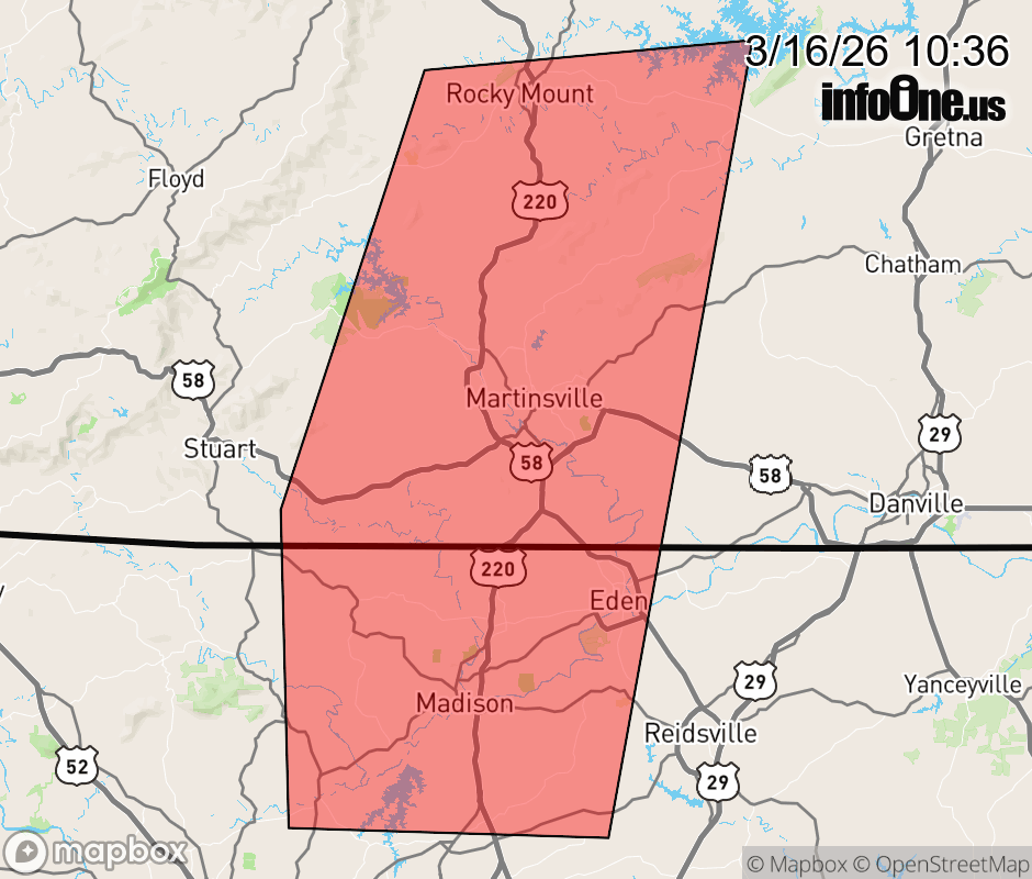 Canceled 3/16/26 10:45 AM Severe Thunderstorm Warning issued March 16 at 10:35AM EDT until March 16 at 10:45AM EDT by NWS Blacksburg VA At 1033 AM EDT, severe thunderstorms were located along a line extending from near Sydnorsville to near Ellisboro, moving east at 45 mph. This is a separate warning from the Tornado Warning currently issued for the City of Martinsville and central Henry County. HAZARD...60 mph wind gusts. SOURCE...Radar indicated. IMPACT...Expect damage to roofs, siding, and trees. Locations impacted include... Eden... Martinsville... Rocky Mount... Wentworth... Mayodan... Madison... and Walnut Cove. ![]() |