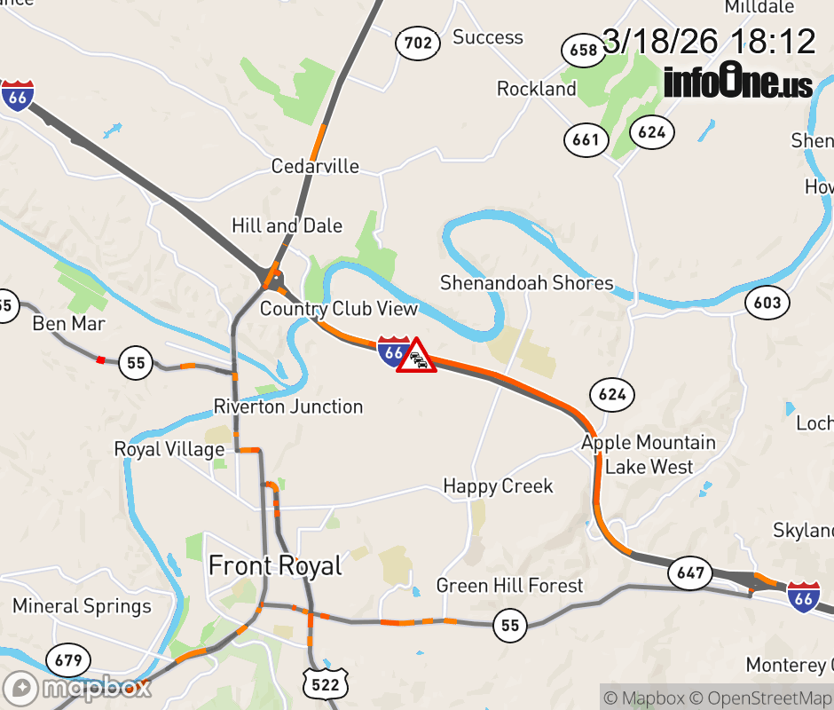 On I-66 West at mile marker 8.6 in the County of Warren, motorists can expect delays due to a vehicle fire. Traffic backups are approximately 3.0 miles. Updated: Wed 3/18/26 6:12 PM EDT ![]() Updated: Wed 3/18/26 6:12 PM EDT |