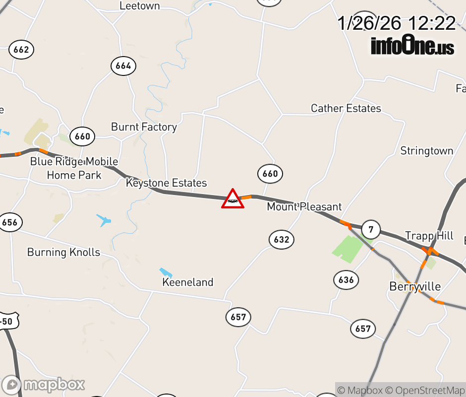 On VA-7 in the County of Clarke, in the vicinity of Russell Rd; Xver; Rt. 660N/S (Clarke County), motorists can expect delays due to a vehicle crash. The east right lane and right shoulder are closed. ![]() |