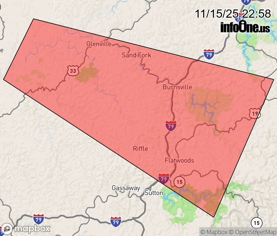 Canceled 11/15/25 11:30 PM Severe Thunderstorm Warning issued November 15 at 10:57PM EST until November 15 at 11:30PM EST by NWS Charleston WV SVRRLX The National Weather Service in Charleston West Virginia has issued a * Severe Thunderstorm Warning for... Northeastern Calhoun County in north central West Virginia... Central Gilmer County in north central West Virginia... South central Lewis County in northern West Virginia... Northeastern Braxton County in north central West Virginia... * Until 1130 PM EST. * At 1056 PM EST, a severe thunderstorm was located near Cedar Creek State Park, or near Glenville, moving southeast at 45 mph. HAZARD...60 mph wind gusts. SOURCE...Radar indicated. IMPACT...Expect damage to roofs, siding, and trees. * Locations impacted include... Glenville, Cedar Creek State Park, Burnsville, Flatwoods, Sand Fork, Stouts Mills, Exchange, Heaters, Walkersville, Ireland, Stumptown, Cedarville, Centralia, Normantown, and Falls Mills. This includes Interstate 79 between mile markers 65 and 83. ![]() |