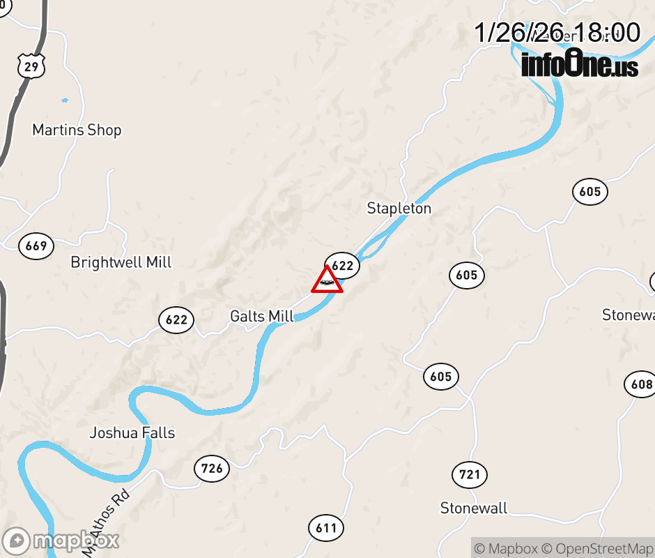 On Rt. 622 East in the County of Amherst, in the vicinity of Beck Creek Rd; Kanawa Ln; Rt. 648N/S (Amherst County), motorists can expect delays due to a vehicle crash. Lane closures exist. Updated: Mon 1/26/26 6:00 PM EST ![]() Updated: Mon 1/26/26 6:00 PM EST |