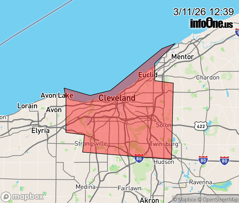 Canceled 3/11/26 12:45 PM Severe Thunderstorm Warning issued March 11 at 12:38PM EDT until March 11 at 12:45PM EDT by NWS Cleveland OH At 1238 PM EDT, severe thunderstorms were located along a line extending from 6 miles south of Perry to 6 miles northwest of Garrettsville to near Mogadore, moving east at 70 mph. HAZARD...60 mph wind gusts. SOURCE...Radar indicated. IMPACT...Expect damage to trees and power lines. Locations impacted include... Cleveland, Parma, Lakewood, Euclid, Cleveland Heights, Strongsville, Brunswick, Westlake, North Royalton, Solon, Avon Lake, Hudson, Twinsburg, Warrensville Heights, Macedonia, Highland Hills, North Olmsted, Garfield Heights, Shaker Heights, and Maple Heights. ![]() |