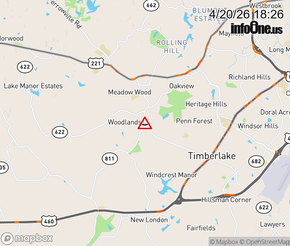 On Rt. 811 North in the County of Bedford, in the vicinity of Waterlick Rd; Rt. 622E/W (Bedford County), motorists can expect delays due to a vehicle crash. Lane closures exist. Updated: Mon 4/20/26 6:26 PM EDT ![]() Updated: Mon 4/20/26 6:26 PM EDT |