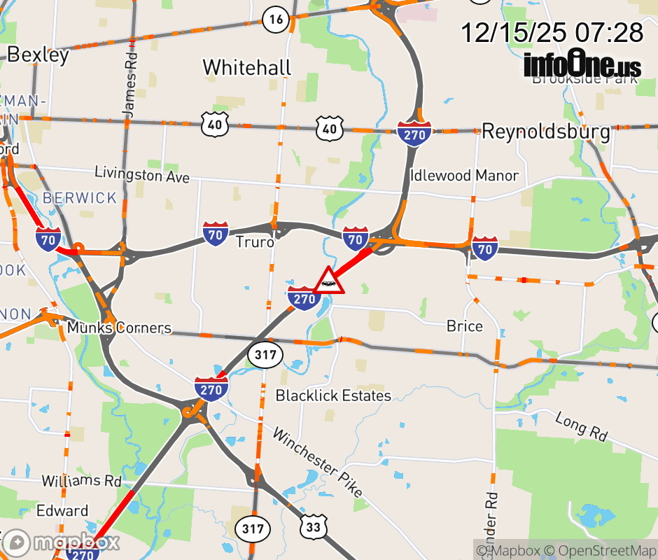 The right lane is closed on I-270 South beyond I-70, due to a crash. Updated: Mon 12/15/25 7:28 AM EST ![]() Updated: Mon 12/15/25 7:28 AM EST |
