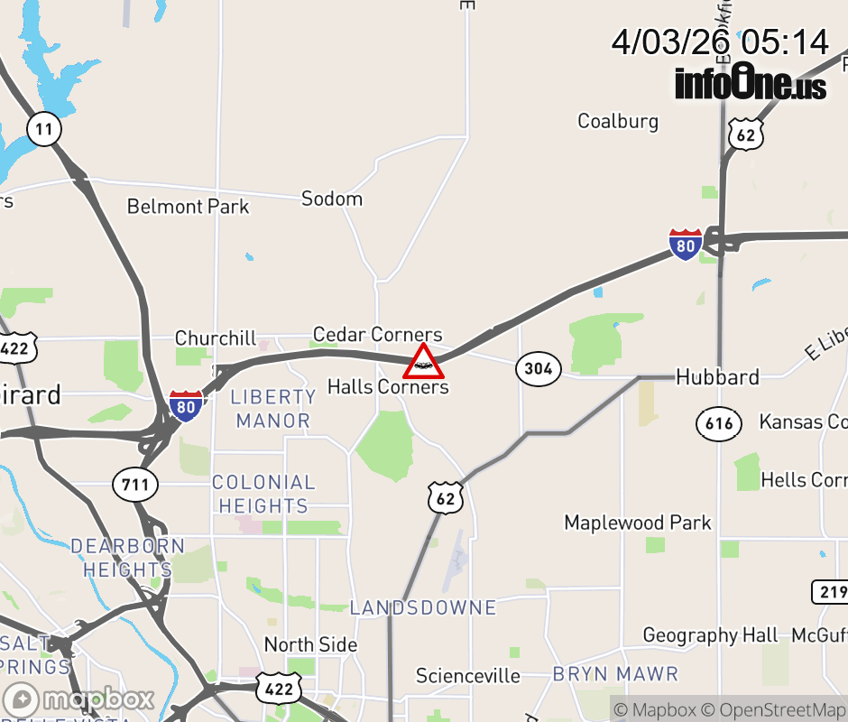 The right shoulder is blocked on I-80 West beyond US-62/SR-7/Sharon Pa/Hubbard, due to a crash. ![]() |