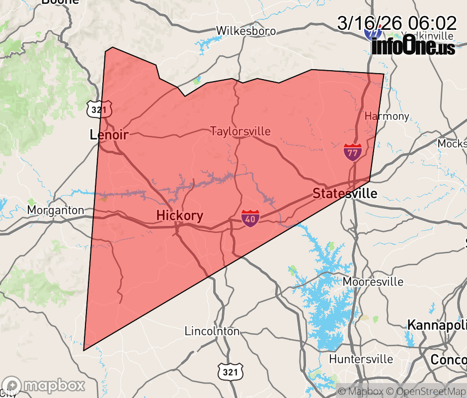 Canceled 3/16/26 6:30 AM Special Weather Statement issued March 16 at 6:01AM EDT by NWS Greenville-Spartanburg SC At 600 AM EDT, Doppler radar was tracking strong thunderstorms along a line extending from 10 miles east of Blowing Rock to 14 miles southeast of Morganton. Movement was northeast at 45 mph. HAZARD...Wind gusts up to 50 mph and pea size hail. SOURCE...Radar indicated. IMPACT...Gusty winds could knock down tree limbs and blow around unsecured objects. Minor hail damage to outdoor objects is possible. Locations impacted include... Hickory, Statesville, Lenoir, Newton, Taylorsville, St. Stephens, Conover, Longview, Sawmills, and Granite Falls. ![]() |