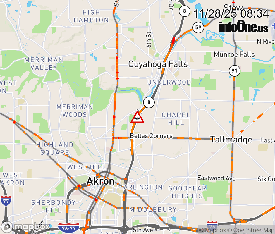 Ramp to Cuyahoga Falls Ave from SR-8 North/SR-59 East is blocked due to crash. Updated: Fri 11/28/25 8:34 AM EST ![]() Updated: Fri 11/28/25 8:34 AM EST |