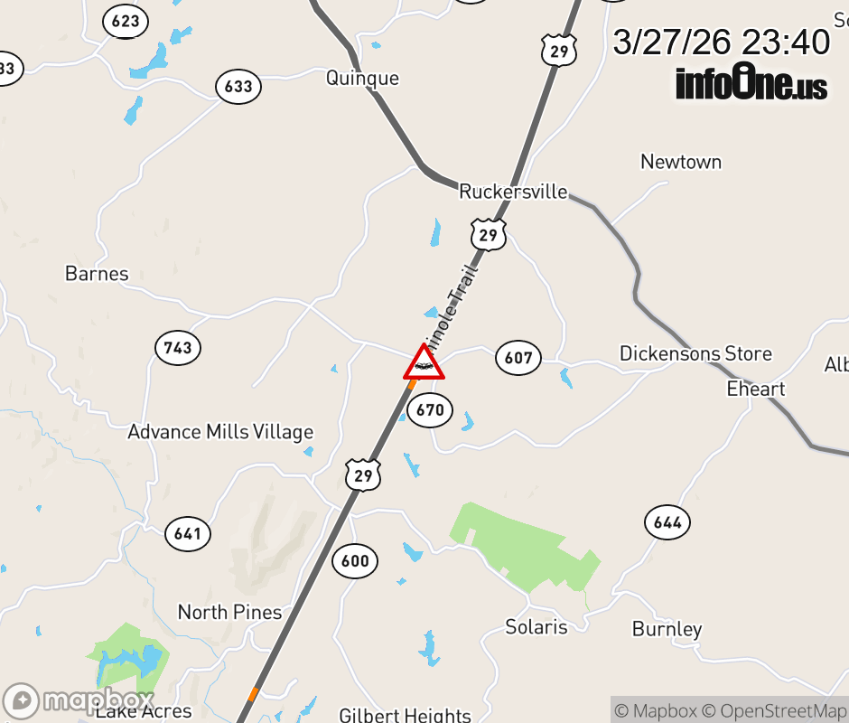 On Rt. 607 in the County of Greene, in the vicinity of Seminole Trl; US-29N, motorists can expect delays due to a vehicle crash. The east right lane and right shoulder are closed. Updated: Fri 3/27/26 11:40 PM EDT ![]() Updated: Fri 3/27/26 11:40 PM EDT |