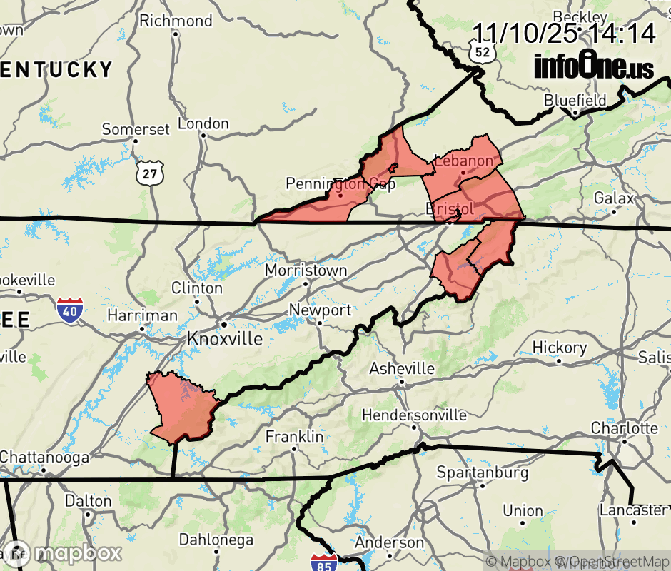 Canceled 11/10/25 6:27 PM Winter Weather Advisory issued November 10 at 2:12PM EST until November 11 at 7:00AM EST by NWS Morristown TN * WHAT... Snow. Additional snow accumulations between 1 to 3 inches. Locally higher totals possible on the tallest ridges and peaks. Winds gusting up to 35 mph. * WHERE... Portions of east Tennessee and southwest Virginia. * WHEN... Until 7 AM EST Tuesday. * IMPACTS... Plan on slippery road conditions. The hazardous conditions could impact the Monday evening and Tuesday morning commutes. ![]() |