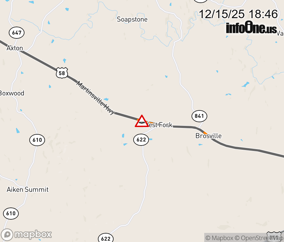 On US-58 in the County of Pittsylvania, in the vicinity of Cascade Rd; Rt. 622N/S (Pittsylvania County), motorists can expect delays due to a vehicle crash. The east left shoulder and left lane are closed. ![]() |